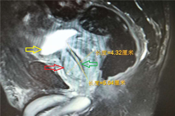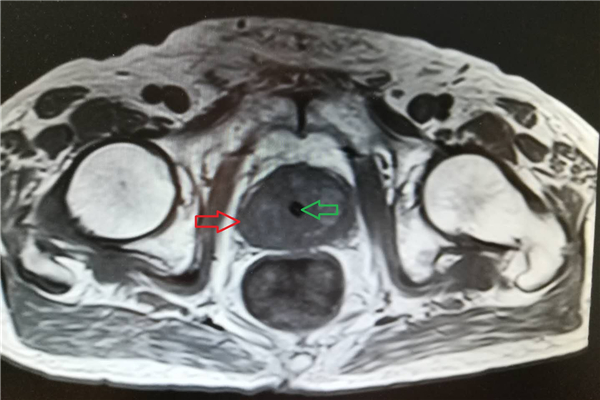 经过术前核磁,可明显看到增大的前列腺(如下图红色箭头所指,黄色箭头所指为膀胱,绿色箭头所指为尿道)