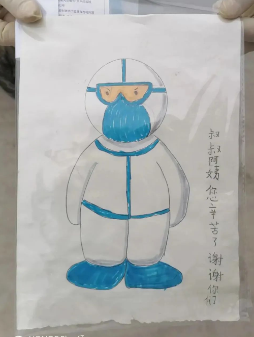 给我印象最深刻是,有一天赶上断崖式降温,穿着薄薄刷手衣的大白穿梭在各个隔离房间,为隔离人员采集核酸,由于温度太低,消毒液凝结成冰,一户一消毒的规范操作却不能停,双手早已冻僵麻木,防护面屏上的片片冰花那样美丽,想想家中稚子高堂,尽管冻出眼泪,手脚冰凉,我们依然互相鼓励着,坚持着克服困难,完成任务。