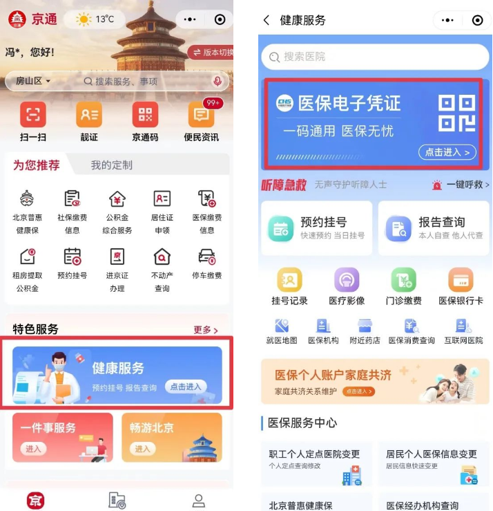 在微信、支付宝中搜索“京通”小程序,点击进入“健康服务”页面,选择“医保电子凭证”“医保银行卡管理”分别注册激活医保电子凭证、绑定银行卡。就诊后点击“医保门诊缴费”,即可在线完成门诊费用的医保报销缴费。