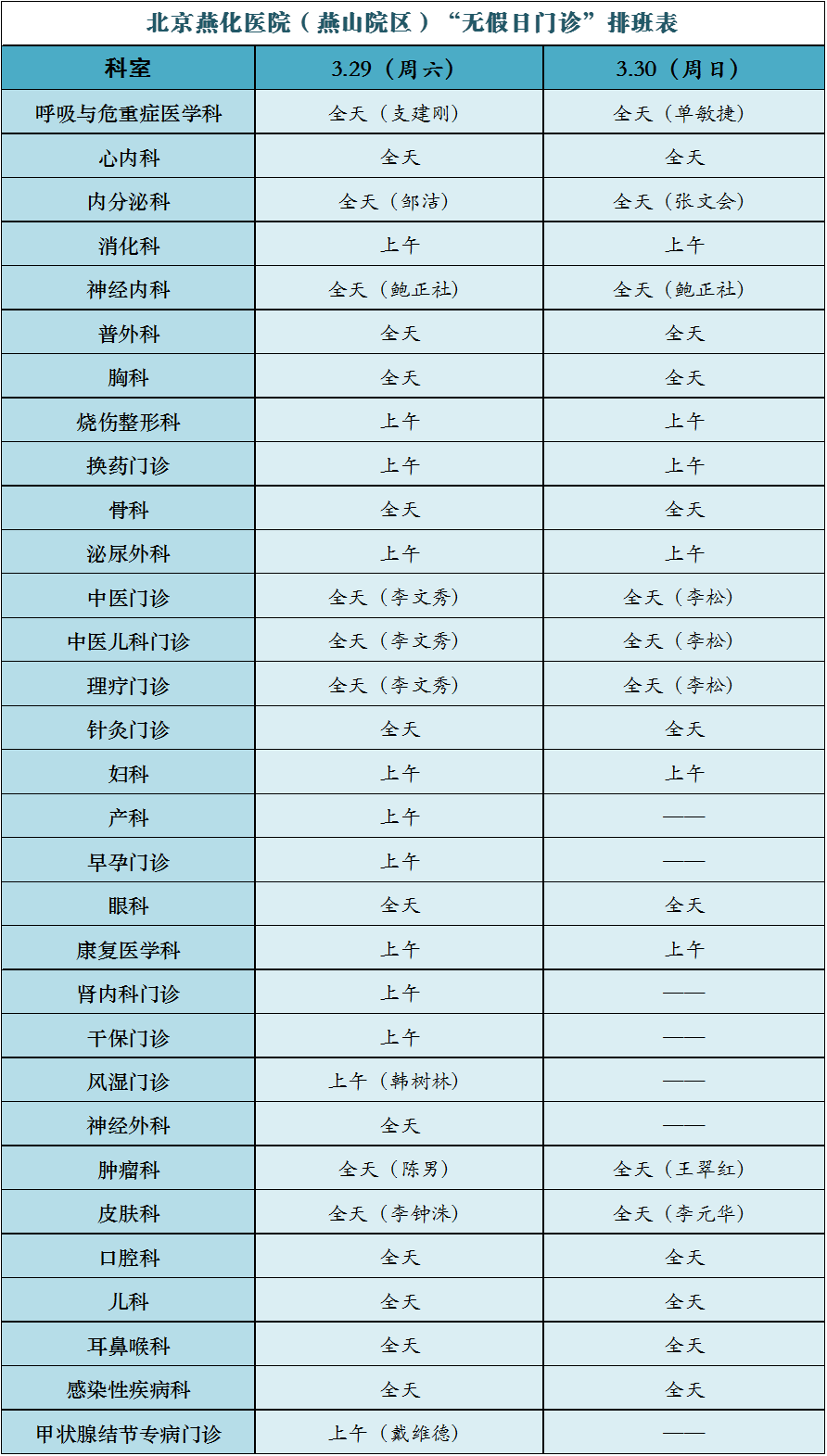 为全力保障百姓就医需求,北京燕化医院继续推行“无假日门诊”。部分科室及出诊专家会有所调整,快来看看有没有您想要咨询的医生!