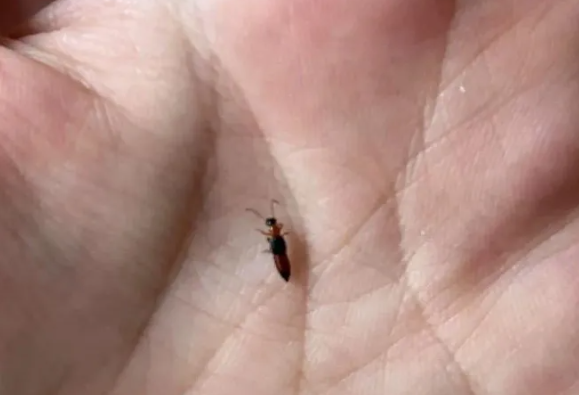 隐翅虫种类繁多,我国昆虫学家经过大量实地调查研究发现在我国约有20余种,主要分布于我国南方和中部的山林、草地、田间、湖泊、河流等自然环境中,在北京天津黑龙江等地也有发现,昼伏夜出,夏秋季节比较活跃。引起隐翅虫皮炎的种类主要是梭毒隐翅虫,也叫毒隐翅虫,体长接近1厘米,形态类似于普通蚂蚁,颜色为红黑相间带有金属光泽(如下图)。其体内带有酸性毒液,当人的皮肤接触到此酸性毒夜时发生炎症反应,因此隐翅虫皮炎本质上是原发刺激性接触性皮炎,犹如接触到酸碱等毒性物质引发皮炎。隐翅虫皮炎在南方时常有集中爆发的文献报道,夏秋季节是常见病,在北京地区偶有听说散发病例。
