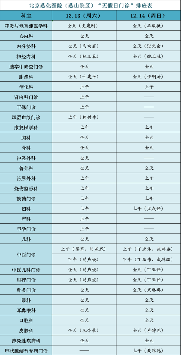 现将本周末(2025年12月13日-14日)“无假日门诊”安排表公布如下: