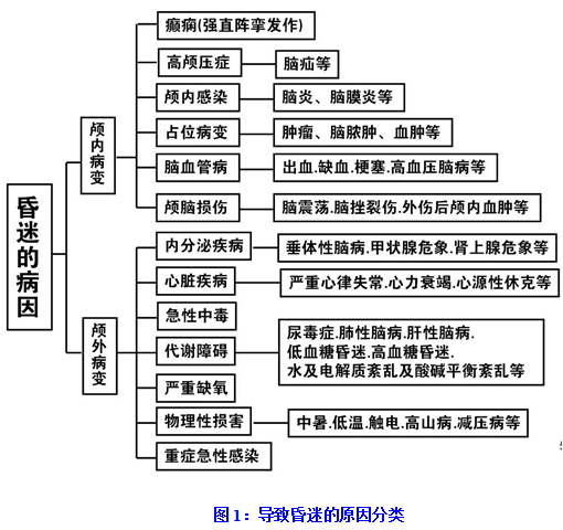 昏迷可以由多种情况造成,其病因分类也因不同的角度而异。临床上将其主要分为颅内病变及颅外病变两大类(图1)。