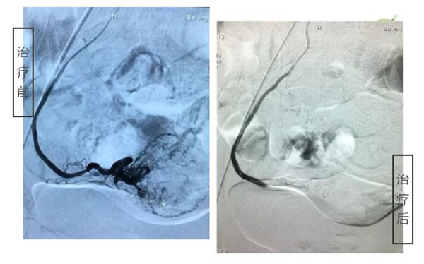 子宫动脉栓塞术是治疗子宫腺肌病的方案之一,是一种微创介入手术。只需在患者大腿根部做2个针眼大小的孔径作为穿刺点,通过这个穿刺点,将2mm粗细的导管分别伸入到两侧子宫腺肌症的供血动脉——子宫动脉,经导管注入定量的栓塞颗粒,以切断给子宫腺肌供血的血管,造成腺肌症组织营养和养分供应中断而坏死脱落,达到疾病治疗的目的。通俗地说,就是“饿死”子宫腺肌组织,没有了养分的输送,子宫腺肌就会萎缩坏死,或被吸收,或被排出体外。