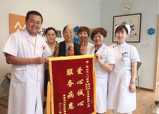 2018年6月22日,端午节后的化一门诊部显得更忙碌了,连续几天日均门诊量都达到180余人。忙碌之余,医务人员迎来了暖心的一幕。患者“马大姐”将一面“爱心诚心,服务病患”的锦旗送到化一门诊部医务人员手中,表达对全体医务人员的感激之情!