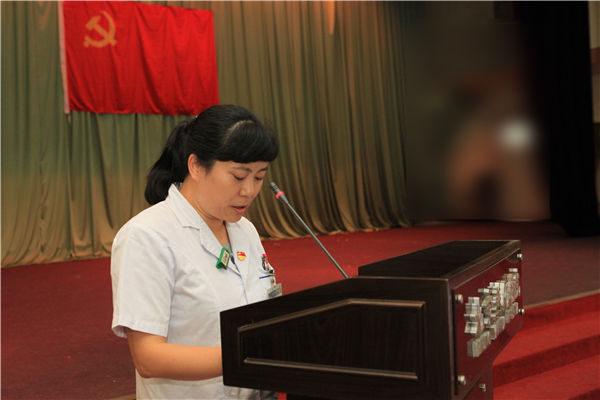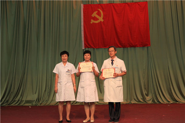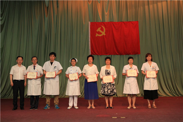 杨金龙同志宣读表彰决定,经院党委研究决定,授予内科党支部、医技党支部为先进党支部荣誉称号,授予常金萍、夏宪军、邓琪、黎荣福、王文清、喻翠、张华昌、王波、兰思杨、马安阳、聂殿波、齐飞、孙国芳、佟春燕、赵钢、高艳玲、乔红艳17名同志为优秀共产党员荣誉称号,授予程育博、陈岩、孙占琴、李金燕、朱玉华、王晖、孙爱梅7名同志为优秀党务工作者荣誉称号。