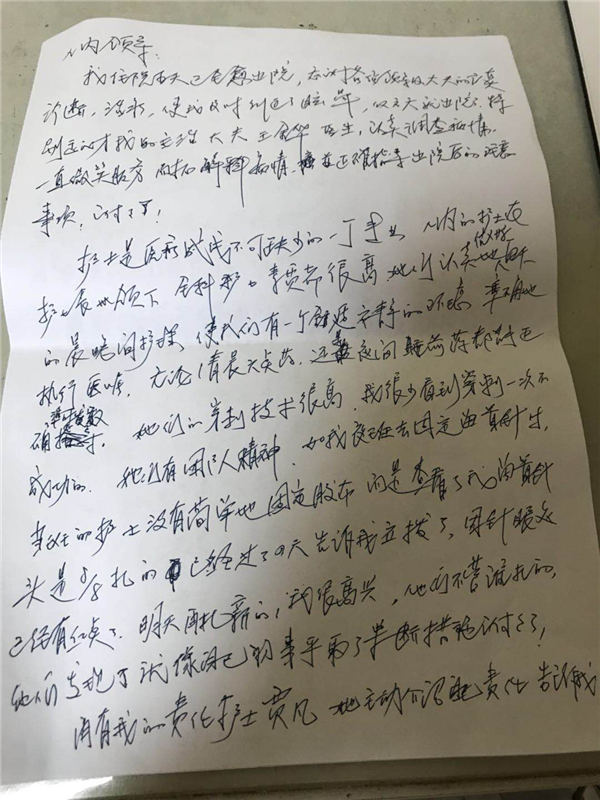 8月13日下午,住院患者张阿姨将自己亲手写的一封表扬信交到了神经内科护士长王静的手中,老人担心自己的字迹不够清晰,看不清楚,于是便特意为护士们极富感情地现场朗读了一遍。