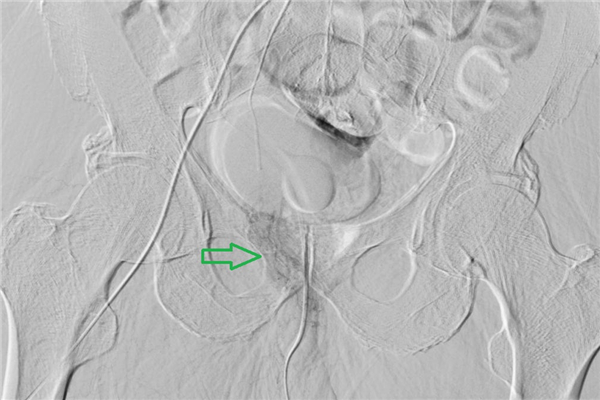 下图中,红色箭头所指为前列腺动脉,绿色箭头所指阴影部位为增生的左侧前列腺染色。