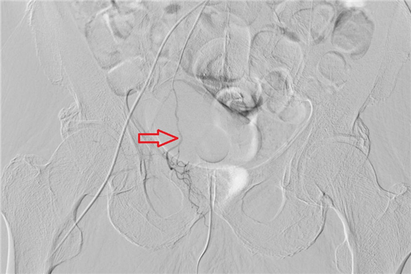 对右侧前列腺动脉进行栓塞后,再次造影显示,右侧前列腺动脉分支和前列腺染色均消失(如下图)。