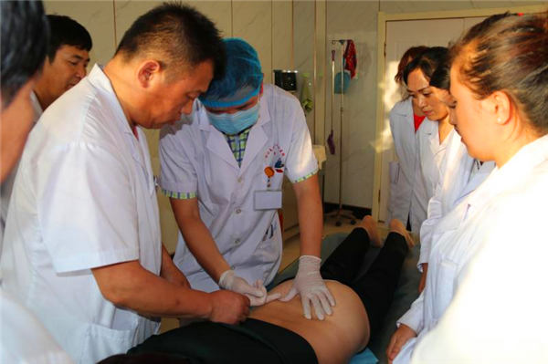义诊结束后,金月英副主任为妇产科医生进行了专业知识讲课,毛成主治医师手把手向医务人员传授针刀治疗技术。