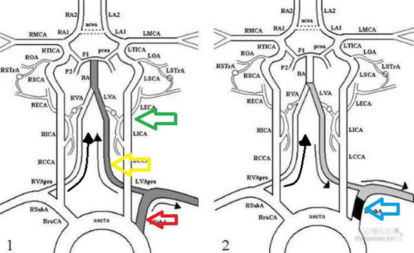 人体头颅正常主要是四根动脉供血,分别是两根颈动脉(上图1绿色箭头所示)、两根椎动脉(上图1黄色箭头所示),其中椎动脉是从锁骨下动脉(上图1红色箭头所示)发出,四根动脉血流方向均是通往颅内,相互之间有丰富的交通支。当锁骨下动脉起始部由于粥样硬化、外伤、感染等各种原因出现狭窄、闭塞时(上图2蓝色箭头所示部位),同侧的椎动脉血流方向出现逆转,不但不往头颅供血,反而通过交通支从头颅“盗血”往上肢供血,从而导致脑缺血,出现头晕等症状。而上肢虽然有椎动脉从头颅所“盗”的血予以供应,但由于锁骨下动脉狭窄或者闭塞,仍无法满足正常所需血液,顾而会出现上肢无力、发冷、脉搏弱等症状。