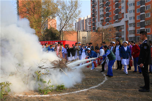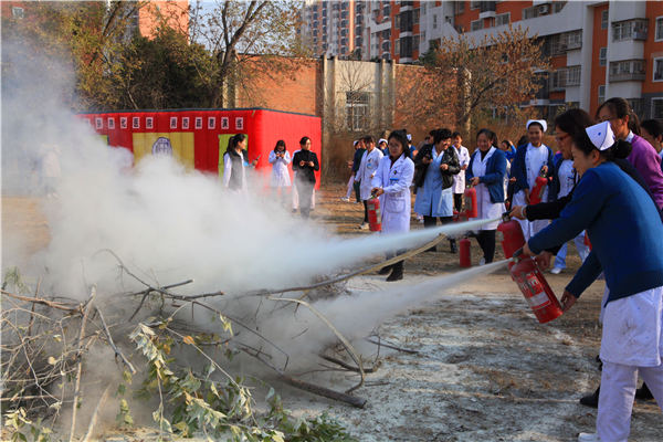 培训结束后,全体医务人员来到医院后操场进行室外消防演练,演练分灭火和紧急疏散两项内容。首先大家进行了灭火器实地操作演练,大家一一拿起灭火器,拔掉保险销,将喷嘴对准火苗根部,按压鸭嘴进行迅速灭火;随后进行失火现场疏散演练,火灾发生后,大家用湿毛巾或其他织物捂住口鼻,根据火场烟气流动规律,采取低姿行走、探步前进的方法,有顺序地进行撤离。