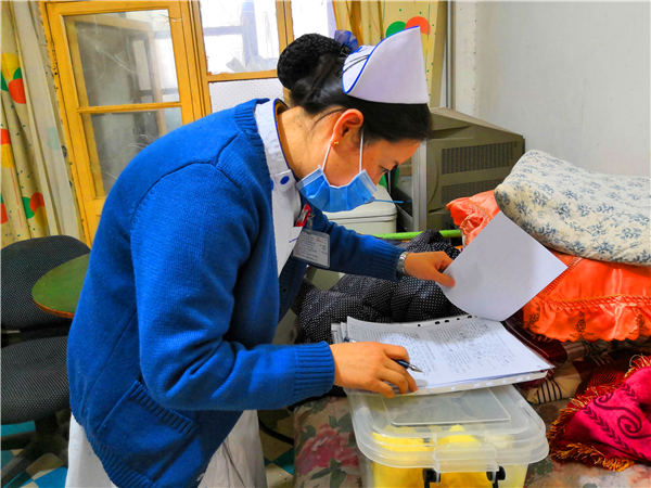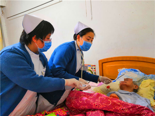 12月11日,任宁宁、宋艳辉整装待发。下午她们顶着寒风,步行跟随一位家属来到医院附近的养老院,为一位75岁的阿尔兹海默症老人做胃管置换。
