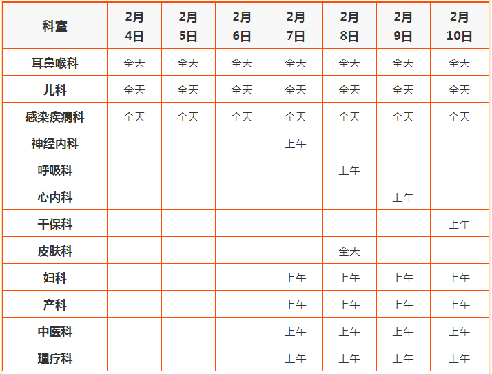 3、眼科、口腔科、内分泌科、消化科、风湿免疫血液科、外科系统(普外、烧伤、骨科、胸外科、泌尿外科、神经外科)在此期间无门诊。