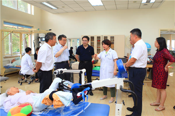 随后,大家参观了医院康复科康复大厅,现场观看了残疾人康复训练,并与残疾患者进行亲切交谈,了解残疾人的康复情况。董连民理事长对燕化医院开展的残疾人居家康复项目工作给予了充分肯定,很好地满足了残疾人的需求。他强调,开展肢体残疾人居家康复服务,对肢体残疾人进行有效系统的康复治疗,同时指导培训肢体残疾人家属,防止了残疾人的二次损伤和并发症的发生,改善了残疾人的身体功能,提高了残疾人生活质量,增强了残疾人日常生活能力与和社会参与能力,北京燕化医院所做的这种居家康复服务的成功模式和做法值得在全市范围进行推广。