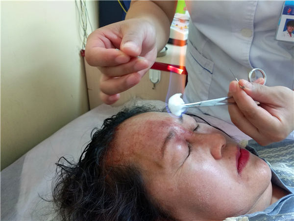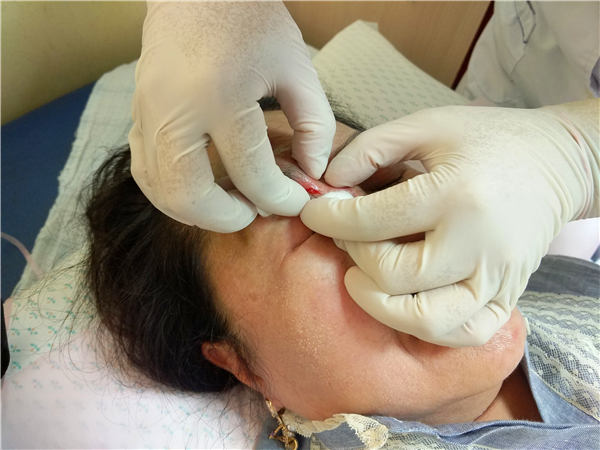 我经过仔细问诊和辩证后,首先给予患者营养神经类药物、抗病毒药物、外用软膏,后进行针灸治疗。考虑到患者的病程长,已经是后遗神经痛阶段,并且此次来华较为匆忙,家里还有事宜,在京只能停留3天,要等到10天后再来治疗,故治疗上我给予患者刺络放血疗法、火针治疗、毫针围刺治疗等多种针法并用,行针后再给患者进行局部艾灸治疗,在治疗带状疱疹的同时,对患者由于尿路感染引起的小便淋沥症状,我也用针法进行了调理。由于患者皮损痒痛部位包含眼部危险地带,行放血和火针点刺术时对医生诊疗水平要求很高,我结合所学专业和以往的经验,用专业和娴熟的手法掌握进针深浅和力度,避免伤及眼球。