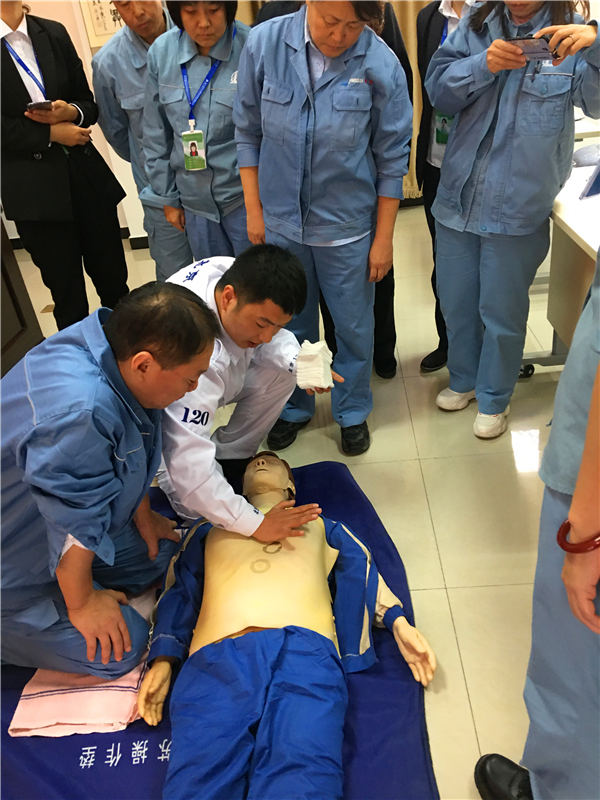 课后,院前急救科的韩加良医生手把手的指导大家如何进行心肺复苏的实际操作。参加人员逐一对模拟假人进行了口对口的人工呼吸和胸外按压操作,并对不规范的动作及时进行了纠正,员工参与学习的热情高涨,感觉规范实用,受益匪浅。