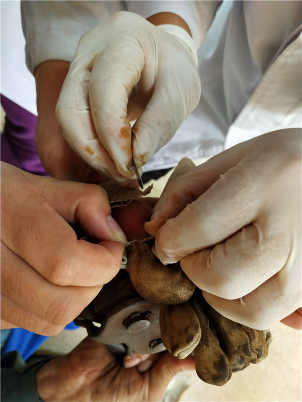 看到车师傅手上还戴着手套,护士长李时心想,如果先把手套除掉,就可以进一步看清卡住手指的部位,也可能把卡住的大拇指适当放松,使铁钩锁扣不至于夹得太紧导致手指坏死。于是她用小刀片将车师傅戴的手套一点点划破,又小心翼翼地将套在手指上的手套上的碎片一一剪掉,就这样,手套被拆分为一丝丝的细线脱离手指,突然“叮当”一声响,就在剪开手套的过程中,可能是由于反复的松动,铁钩从车师傅的手上掉了下来,大家都惊喜地松了一口气。
