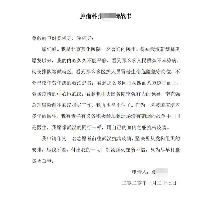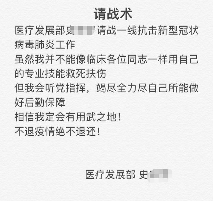 病毒无情人有情,疾病隔绝了我们,却隔绝不了我们之间的感情。北京燕化医院医护、行政后勤人员的报名请战书还在不断的递交中,我们已做好准备,随时出征武汉!