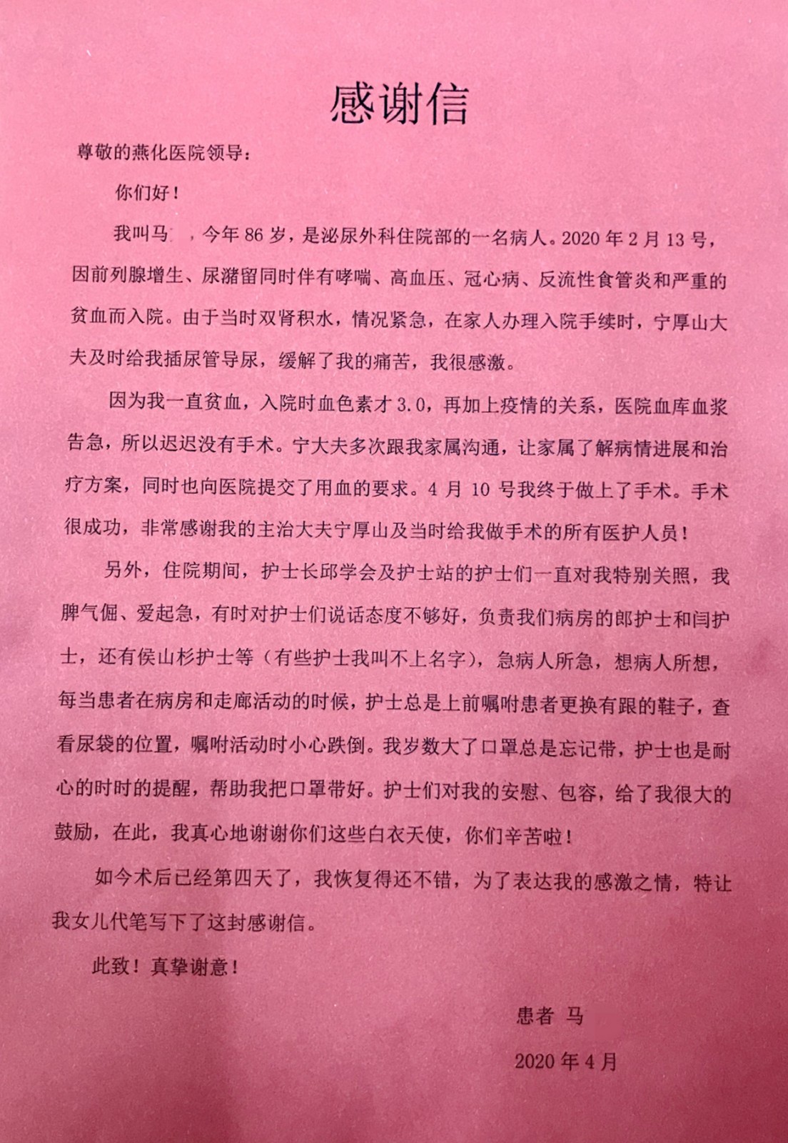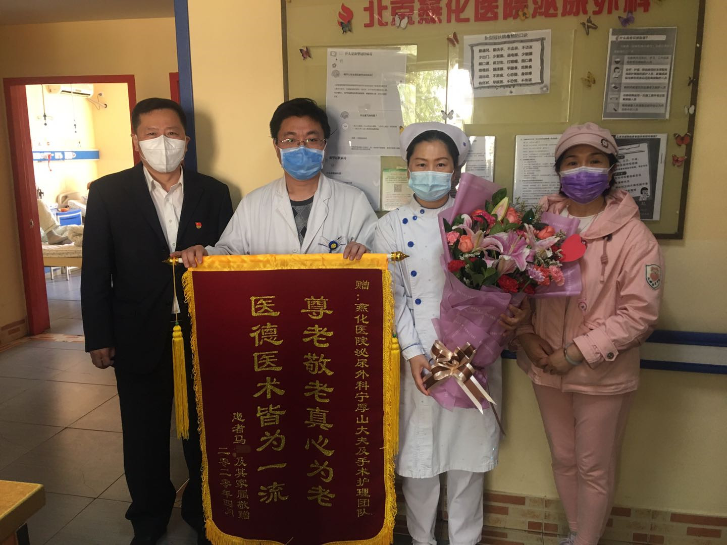 为了表达感激之情,马大爷的女儿特意为泌尿外科医护团队送来一面锦旗。她说:“老爷子此次发病,着实让我后怕,幸亏有医生护士们的全力救治,及时为我父亲解除病痛,使我父亲化险为夷,太感谢了”。