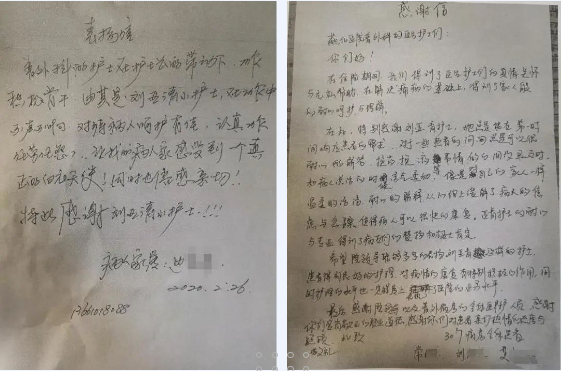 事后,刘女士很是过意不去,亲自写了封感谢信,对护士刘亚青不怕脏、不怕累,徒手助其通便的行为表示感动,就是亲生闺女也很难做到。