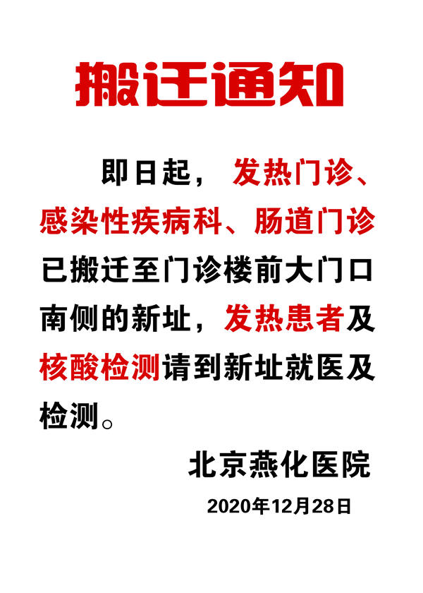 北京燕化医院发热门诊和核酸采集点自2020年12月28日迁至医院东大门南侧新址,特此告知,请相互转告。