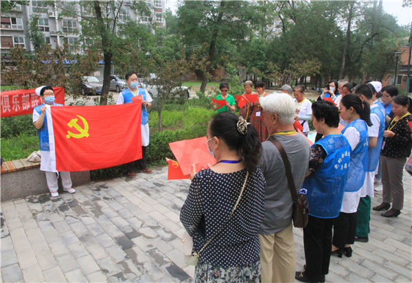活动的第一个环节是《我爱你中国》诗朗诵,工作人员给每人发了一张朗诵稿,大家围成一个圈,王爱华护士长和张兴华医生手拿党旗,申仕莲秘书长、陈岩主任、夏火生主任和在场的一位党员患者一起朗诵,在委婉清丽的伴奏旋律中,所有人带着激动的心情,声情并茂地朗诵着“我爱你碧波滚滚的南海,我爱你白雪飘飘的北国,我爱你森林无边,我爱你群山巍峨……我爱你中国”。朗诵完,有位第一次参加活动的肿瘤患者说道:“非常感谢国家,感谢党,没有共产党就没有今天的幸福生活,永远支持党拥护党!”