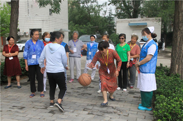 此次联谊会的高潮部分包含两个游戏环节。第一个游戏是“长征接力赛”,大家分为红、黄、蓝三组进行比赛。比赛时,每组分两队分别站在两端,由一端队员开始,边拍篮球边走到对面,再交给另一个队员。如此反复看哪一组用时最短。运球过程中,球掉了,须把球带回掉球位置方可继续进行,由于参加活动的人员有的年龄稍微大一些,好多人很少接触篮球,运球不是很顺利,这给大家带来了不少挑战。最终蓝队队员配合的最为默契,夺得了此次比赛的冠军。