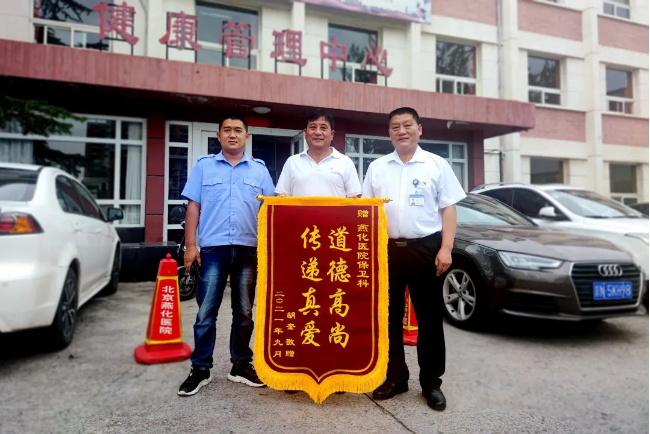前不久,燕化医院院内停车场负责人在院门口捡到一个钱包,里面有几百元钱、北京通卡、公交卡等物品,在一段时间等候无人来人领后,停车场工作人员就把钱包转交给了医院保卫科。保卫科通过钱包内物品信息也没有查找到失主,于是又请求公安部门通过人员信息多方查找,终于在几天后找到失主。这无疑给了失主一个惊喜,本以为没有希望的的钱包居然在几天后在医院找到了,于是便制作了一面锦旗送给燕化医院保卫科和停车场负责人,锦旗上写着“道德高尚,传递真爱”,感谢他们这种拾金不昧的高尚道德。