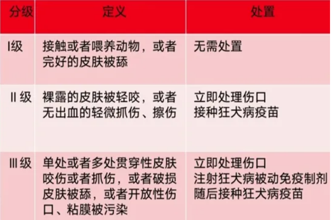 在我工作当中有这么一个件事使我记忆犹新且深刻:有位患者来就诊,其理由是:他的腿被蚊子叮了有一个小小的伤口,在遛弯过程中有一只小狗围着他的伤口转了两圈,他会不会得狂犬病?需不需要打疫苗呢?还有被狗或猫添了皮肤等等……这样那样的问题。那么伤口的暴露分为几个等级级?什么时候什么样的伤口适合打疫苗和被动免疫制剂呢?让我们以图表的形式来了解一下吧!