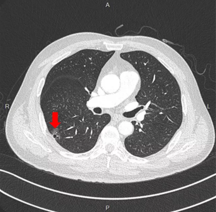 患者入院后完善了相关的化验及检查,虽然肺癌监测结果未见异常,但李简教授和马振东主任通过仔细阅读胸部增强CT片及综合分析病情,考虑患者肺部结节恶性可能性极大。于是在与患者一家充分沟通病情后,为患者进行了右肺下叶背段切除手术。术后病理回报:右肺下叶附壁型肺腺癌。患者病变局限,无远处转移,目前恢复很好,对胸心外科团队诊疗水平和服务十分满意。