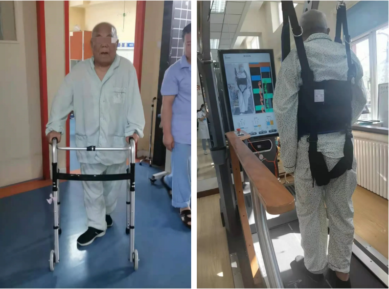 病例2:高**,因脑梗在神经内科住院治疗,因合并严重肺部感染曾两次住进ICU,转入康复医学科时还持续泵入升压药物,留鼻置胃肠管,鼻饲进食,康复医学科给予中药口服、针灸配合床旁踏车等治疗,根据病情变化不断调整治疗方案,逐渐更换为胃管,升压药逐渐减量并撤除,慢慢地可以独自坐立了,再经过精心的治疗,手法训练、下肢机器人、跑台康复训练、步行训练,逐渐可以扶助行器走路了,高大叔每天高兴的合不拢嘴,不到半年的康复,就可以扶助行器回家了。