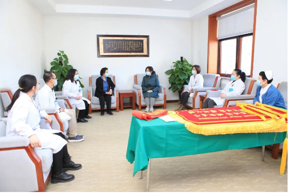 12月29日,赵大哥的妹妹带着感谢信和锦旗来到北京燕化医院对医护人员的救助表示感谢,北京凤凰健康公益基金会秘书长申仕莲以及党群部、肿瘤科、国际部相关人员热情接待了她。赵女士情绪非常激动,她说:“我哥哥目前状况很好,也有了生的希望。在此特别感谢北京凤凰健康公益基金会,感谢燕化医院‘为爱而生’贫困恶性肿瘤患者救助项目的慷慨解囊,为我们全家带来了希望!感谢胡永华副主任医师的大力帮助,感谢申明霞无微不至地关心和指引,让我哥哥有了活下去的勇气!”