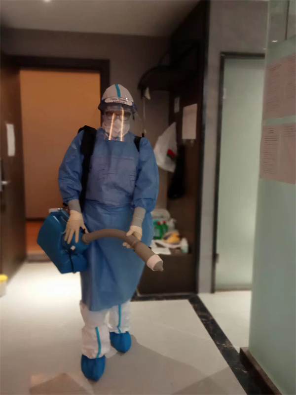 我的第一个班是大夜2班,凌晨4-8点,3:20更衣室穿防护服,穿好后进入红区工作区,一进入红区,我和老师的护目镜立即蒙上了一层雾气,根本看不见,两眼摸黑,电脑上文件夹名都看不见,幸运的是夜班,客人都在睡觉,老师给我讲解各个班次的工作,我靠着墙,很困很困,但不敢闭眼,生怕自己不注意,防护服和护目镜突然移位,或是面屏脱落,发生暴露。时间漫长,好不容易坐到7:30,我开始配消毒液,消毒片需要用拇指一片一片数,因为看不清,消毒壶上的2000毫升刻度,也是依稀可见,配3瓶消毒液竟用了10分钟,之后开始消杀楼道,我一个人背着消杀工具,在阴森森的楼道一边走一边喷杀消毒,眼前朦胧、楼道黑暗而又充满迷雾,我的冬奥保障工作第一个夜班好似在恐怖片中渡过。