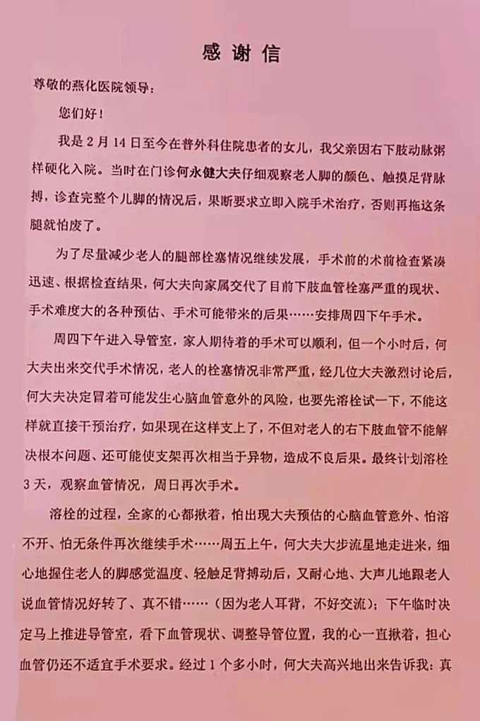 我是2月14日至今在普外科住院患者的女儿,我父亲因右下肢动脉粥样硬化入院。当时在门诊何永健大夫仔细观察老人脚的颜色、触摸足背脉搏,诊查完整个儿脚的情况后,果断要求立即入院手术治疗,否则再拖这条腿就怕废了。
