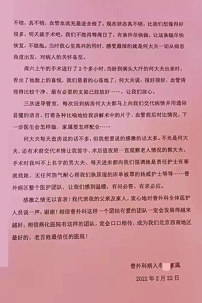 感激之情无以言表!我代表我的父亲及家人,衷心地对普外科全体医护人员说一声:谢谢!相信普外科这样一个团结有爱的团队一定会发展得越来越好。相信燕化医院有这样的团队,定会口口相传,成为我们北京西南地区最好的、老百姓最信任的医院!