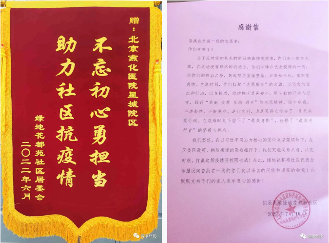 7月20日,房山区拱辰街道绿地花都苑社区居委会书记亲自给星城院区送来一封感谢信和一面烫金的锦旗,上面赫然写着“不忘初心勇担当,助力社区抗疫情”。