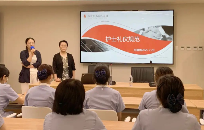 日前,北京燕化医院护理部孙爱梅主任对星城院区全体护士进行了护士礼仪规范培训,全体护士均以精神饱满的状态参加,认真倾听孙主任讲解作为护理人员在医德规范,着装仪表,护理操作等各方面要求,并力求理解透彻。
