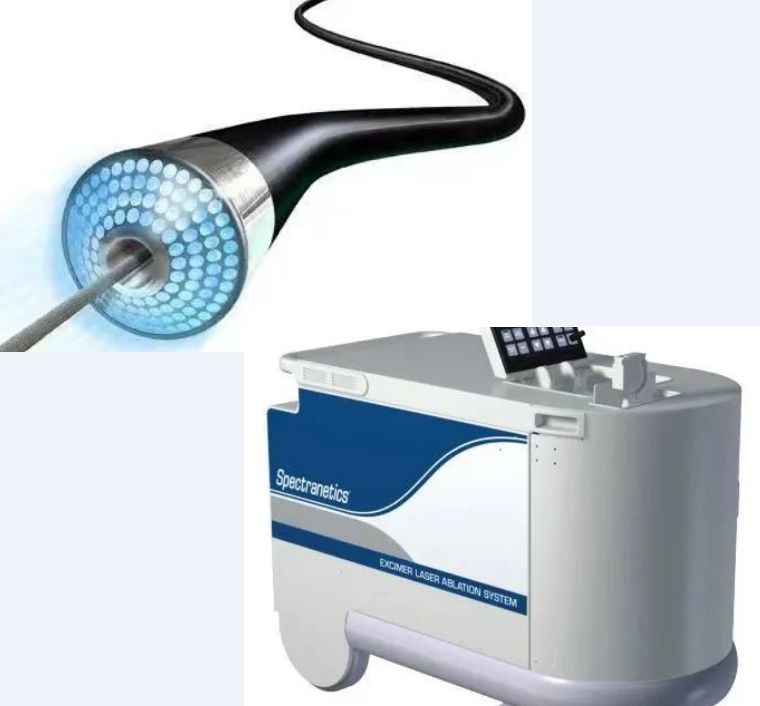 该技术采用波长为308nm的冷激光,通过光化学效应、光热效应和光机械效应三大效应达到治疗效果。即:通过发出高能量脉冲使病变组织内温度升高,组织汽化产生压力,通过迅速膨胀和收缩导致病变组织崩解,消蚀斑块物质,达到改善冠脉血流的效果。病变组织被消蚀成水、气体和微米级的微小物质,避免了血管内栓塞的发生,因而不易引起无复流及围术期心肌梗死等并发症。