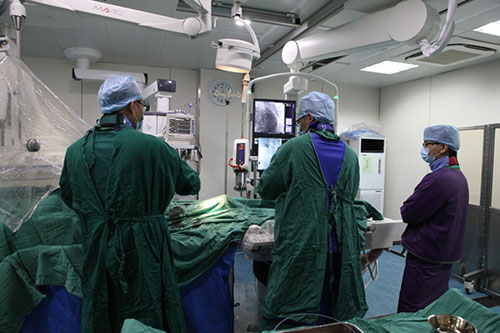 在征得患者家属同意后,医务人员迅速行动,立即联系导管室开放绿色通道,由陈安良主任、何永健、刘庆顺大夫在导管室同仁的配和下,快速准确的找到出血点——胃动脉出血,何永健医生成功地实施了栓塞术,血止住了。这时,已经忘却了时间和疲劳的医务人员的脸上才露出了胜利的笑容。观察患者生命体征平稳后,将其安全送回病房,至下午四点半左右,患者无再次出血发生,宣布抢救成功。