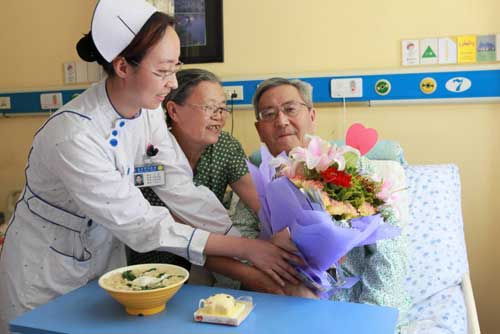 得知今天是杨大爷的生日,今天一早床旁交接班的时候,护士们一进病房就亲切的一起问候老人:“杨大爷,生日快乐,祝您早日康复!”让老人的脸上有了笑容。
