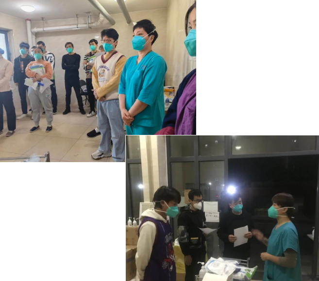 到达隔离点后,我们这个“临时组建,初来乍到,毫无经验”的医疗队,在与之前隔离点各位负责人汇合后,大家进行了简单的自我介绍,我们的工作分为两个区,一个红区,一个是绿区,绿区是王华领队,李玉福是我们红区的领队,对人员进行分组,我和良乡医院梁立杰与古赛和房山中医院的任娇分在一组,分组后我们就立刻进入了工作状态。从搬运防疫物资到整理各种文件,大家很快投入其中,由于入境人员的时间不定,我们在没有收治客人之前,为确保安全稳定,为确保隔离点各项工作稳定开展,保障工作人员及隔离人员自身安全健康,期间我们共进行了相关业务培训5次,对集中隔离点消杀、运维、保安、保洁工作人员进行穿脱防护服的培训和考核,并明确、细化了各岗位职责,王华和李玉福队长带领我们医务人员定期在腾讯会议上组织学习疫情防控的相关文件精神;做好清洁消毒工作人员七步洗手法、消毒液的配比,明确隔离人员、工作人员核酸采样和体温测量的频次;联系防疫物资供应,确保及时安排到位,因为我们要面对的是入境隔离人员,其中大多数又都是外国人,我们还会和一起的翻译员包安娜请教一下,虽然前期做足了准备工作,但在正式接收入境人员时,仍是小事不断。