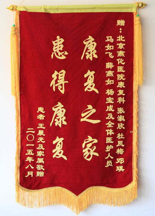 日前,一位老人将一面印有“康复之家、患得康复”的锦旗送到北京燕化医院院办,她激动的说:“我特意来送锦旗的,我儿子瘫痪半年了,燕化医院康复科给治好了,他现在能走了!”。