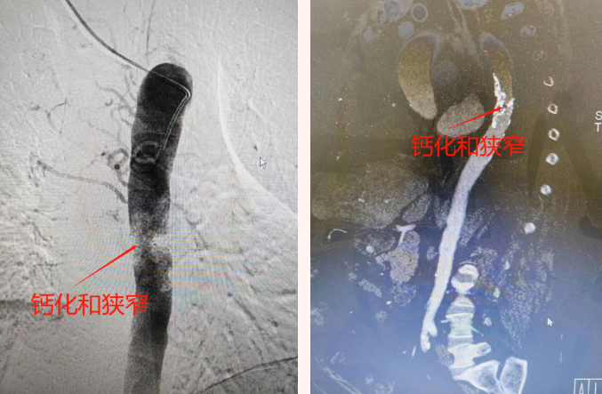 在排除心脏相关疾病后,心血管内科李钢、王志勇副主任医师结合病史对他进行了细致的病情评估与体格检查,发现患者上肢血压高达190/100mmHg,双侧下肢股动脉搏动微弱,下肢血压在90/50mmHg左右,在进一步完善增强CT检查后发现——赵大叔并不是传统意义上的原发性高血压,而是患有罕见的主动脉缩窄,主动脉弓-降主动脉交界处重度狭窄,从而导致血压居高不下。