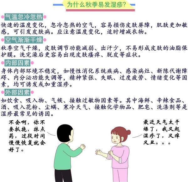 秋季正是湿疹好发季节,天气逐渐转凉,空气比较干燥,皮肤水分脱失,再加上不良情绪、接触某种过敏物质等,使得湿疹卷土而来,主要表现为皮肤上长丘疹、红斑或水泡。那么今天我们就来谈谈湿疹~