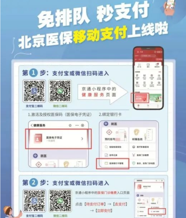 在微信、支付宝中搜索“京通”小程序,点击进入“健康服务”页面,选择“医保电子凭证”“医保银行卡管理”分别注册激活医保电子凭证、绑定银行卡。就诊后点击“医保门诊缴费”,即可在线完成门诊费用的医保报销缴费。