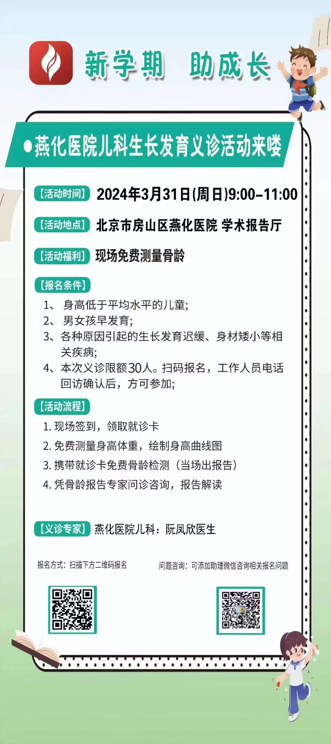 随着人们生活水平的提高,儿童身材矮小、早发育、肥胖等问题日益凸显,严重影响儿童的身体健康和心理健康,儿童内分泌疾病越来越受到家长的关注。燕化医院儿科秉承着“关爱儿童青少年成长”的理念,将于2024年3月31日,在北京燕化医院学术报告厅特举办“新学期 助成长”生长发育义诊公益活动,助力儿童健康成长。
