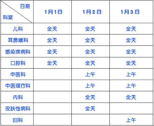全科门诊:1月1日出诊时间为上午8:00-12:00,下午13:00-17:00;1月2日-3日出诊时间为8:00-19:00。