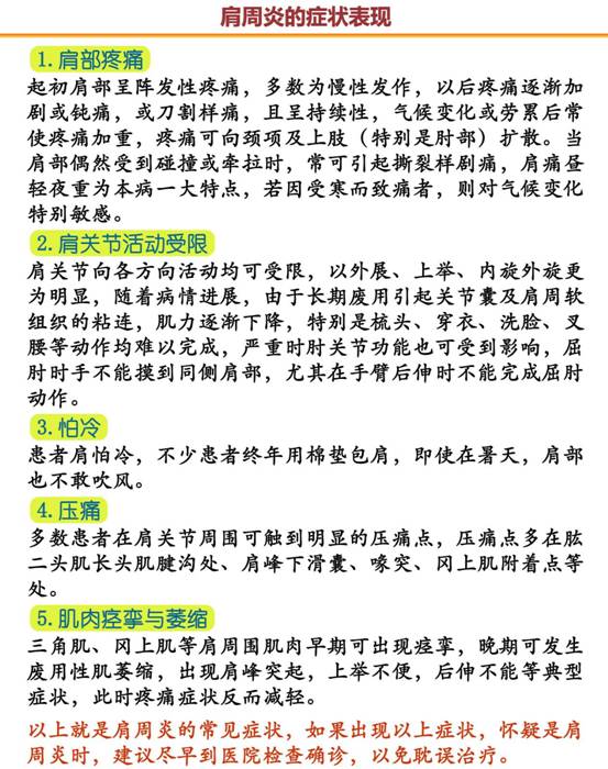 肩周炎是一种常见的疾病,且发病后对身体会产生巨大的影响和危害,早发现、早诊断、早治疗往往是康复的关键和基础,千万不可掉以轻心哦~~
