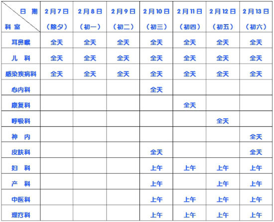全科门诊:2月7日-9日(除夕至初二),出诊时间为上午8:00-12:00,下午13:00-17:00;2月10日-13日(初三至初六),出诊时间为8:00-19:00。